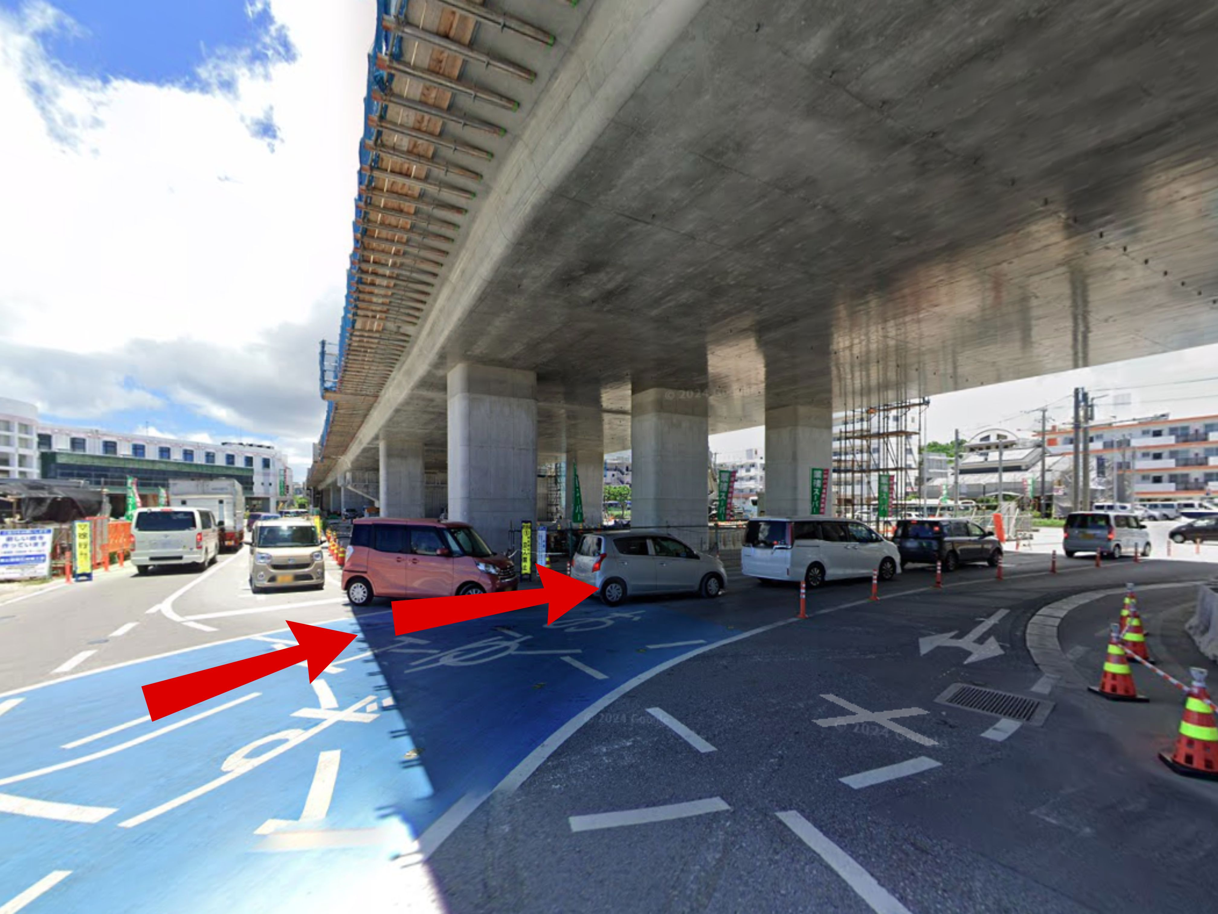 橋梁工事下をくぐり小禄の道路バイパスの交差点に出ます。